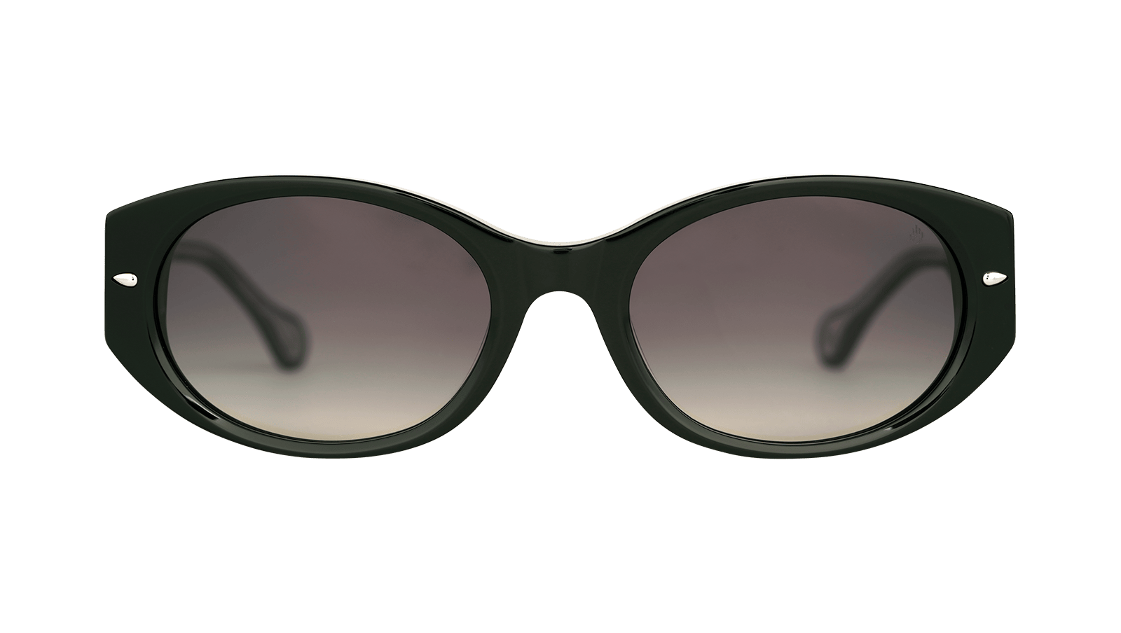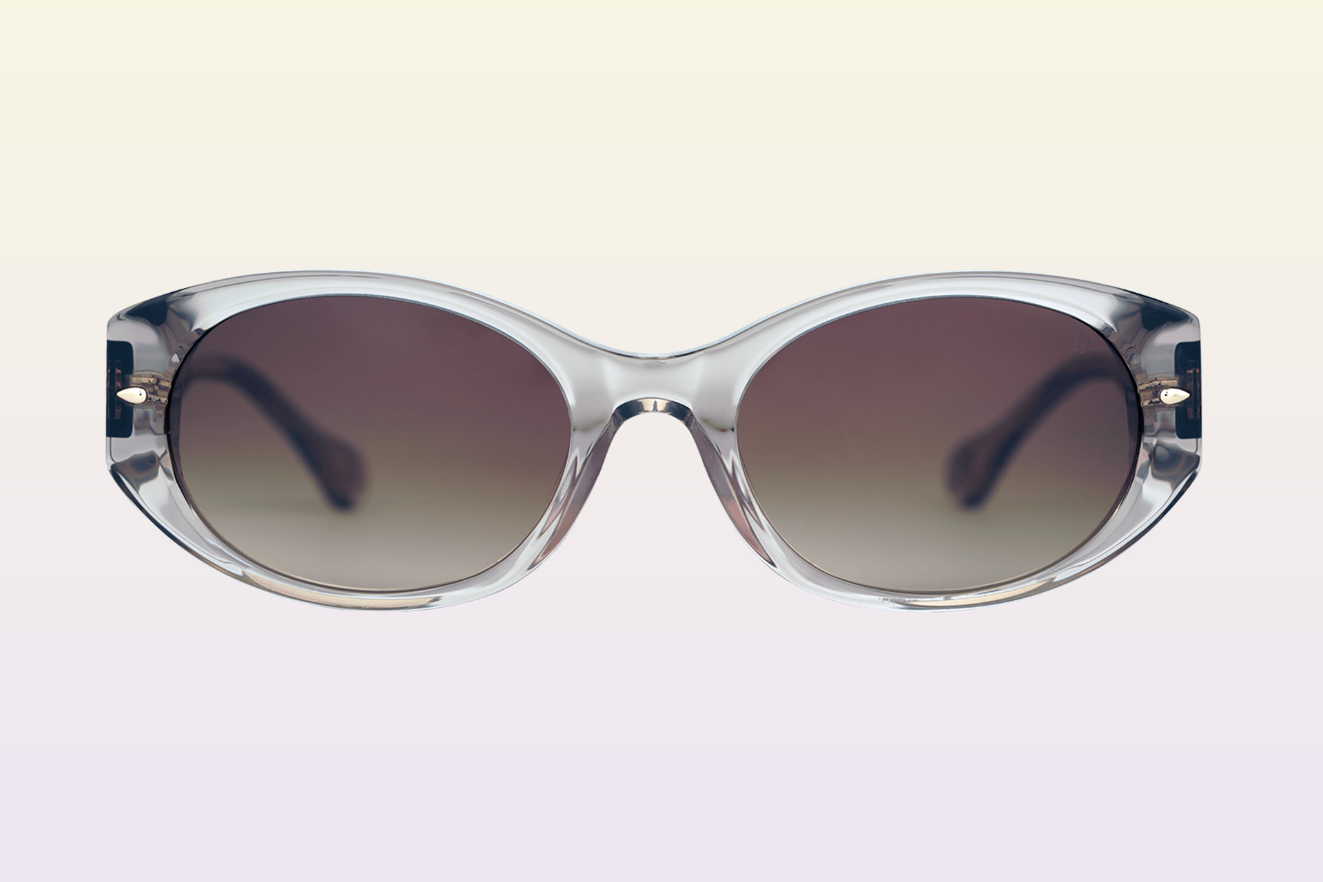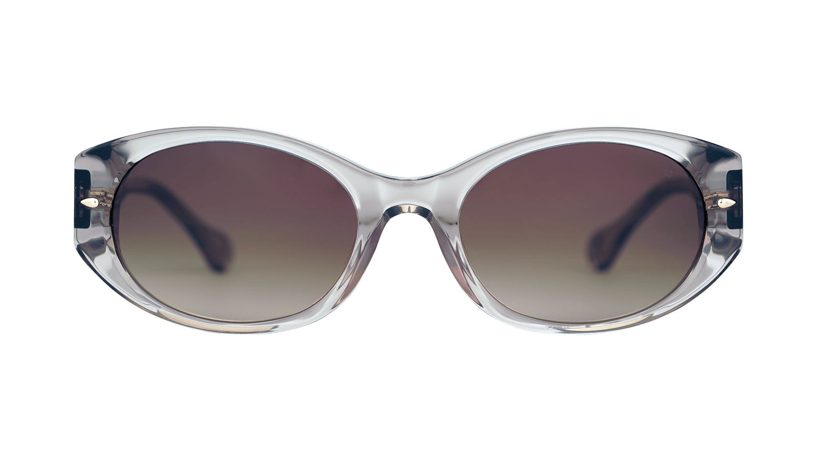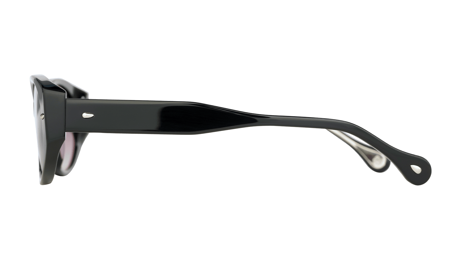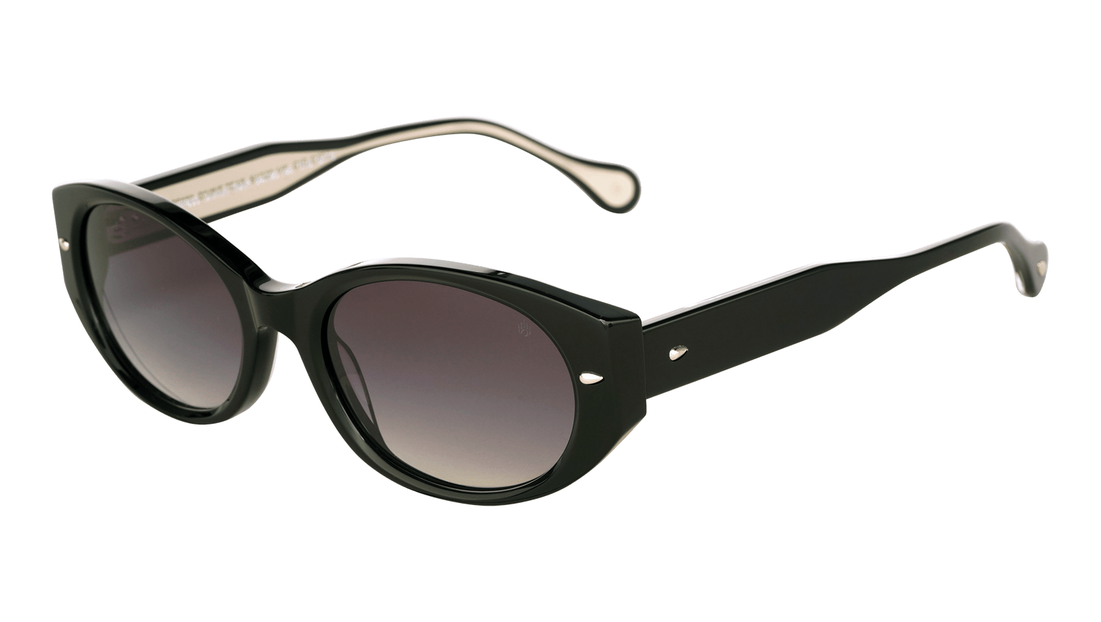 Monture en acétate noir et cristal, métal argenté, verres gris dégradé.