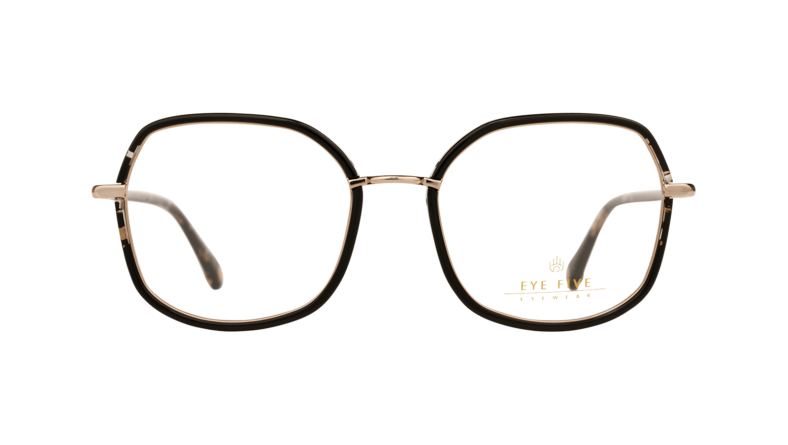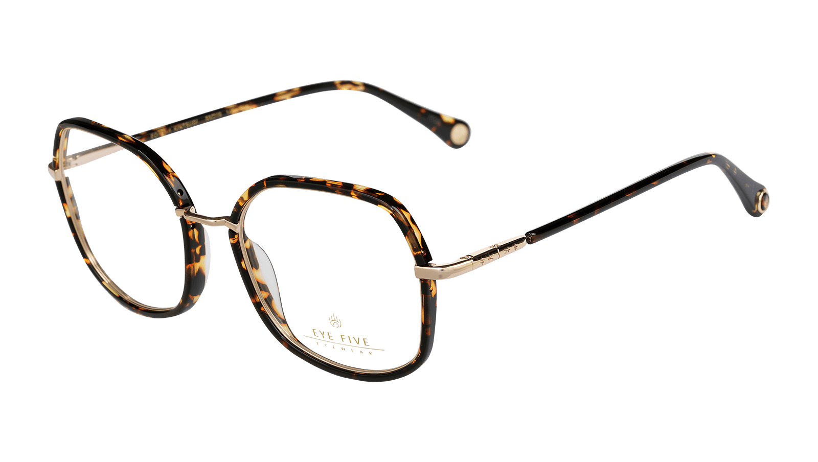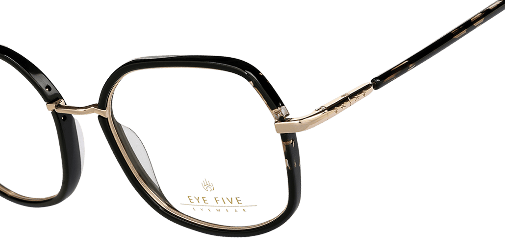 Bout de branche arrondie avec incrustation d’un insert en acétate sur lequel est représenté le symbole Eye five.