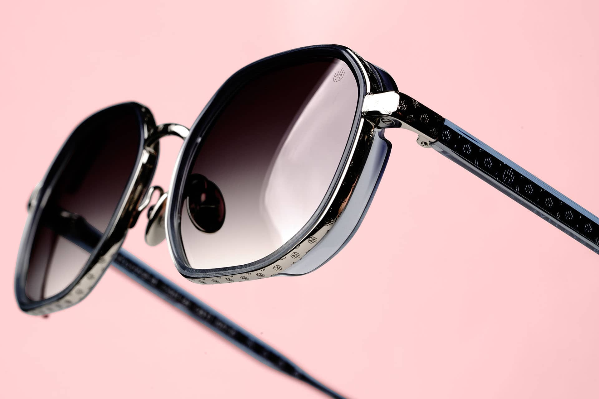Plaquettes nasales en titane gravées au laser, branches en acétates agrémentés d’une plaque en métal reprenant le Monogram Exclusif EYE FIVE.